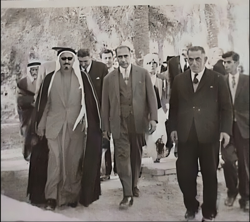الشيخ عبد العزيز الفاضلي، شيخ قبيلة المطوّر في الأحواز، استقبل أمير قطر، الشيخ أحمد بن علي آل ثاني، عام 1960.