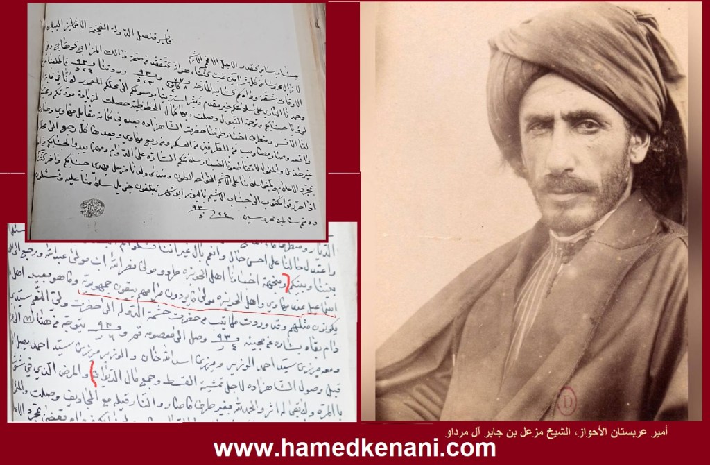 مركز دراسات عربستان الأحواز- حامد الكناني- تُعد الوثيقة التي بعثها الأمير مزعل بن جابر آل مرداو، حاكم المحمرة، إلى القنصل البريطاني عام 1868، من أبرز الشواهد التاريخية على طبيعة الصراعات السياسية في منطقة سهل ميسان (أو دشت ميشان). هذه الرسالة تكشف أبعاد التنافس بين القوى المحلية والعثمانيين والقاجاريين، ودور بريطانيا في توجيه الأحداث في المنطقة.