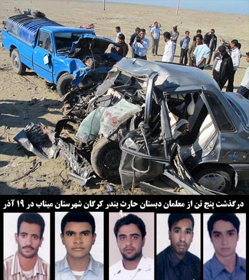 توفي خمسة من مدرسي مدرسة زيد بن حارث الابتدائية الواقعة في مدينة ميناب على الساحل الشرقي للخليج ، و ذلك أثر حادث سير مشكوك صباح يوم أمس السبت العاشر من كانون الاول من العام الجاري.