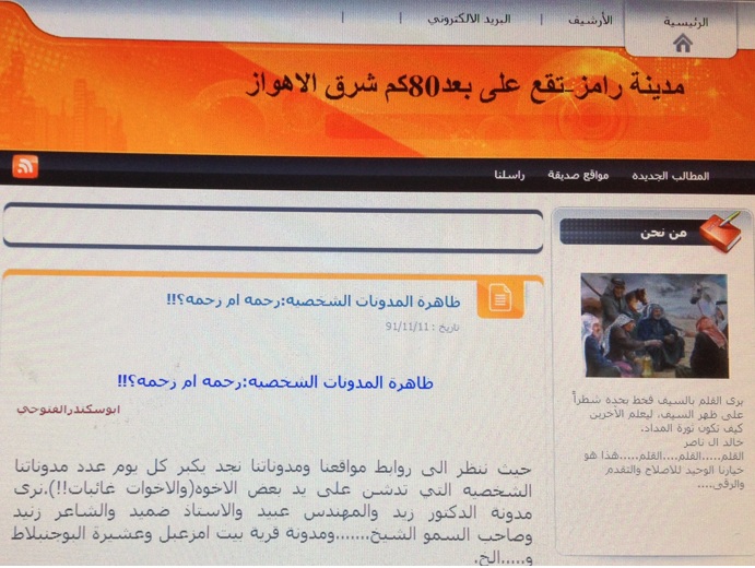 مدونة رامز- حیث ننظر الی روابط مواقعنا ومدوناتنا نجد یکبر کل یوم عدد مدوناتنا الشخصیه التي تدشن علی ید بعض الاخوه(والاخوات غائبات!!).نری مدونة الدکتور زید والمهندس عبید والاستاذ ضمید والشاعر زنید وصاحب السمو الشیخ…….ومدونة قریة بیت امزعبل وعشیرة البوجنبلاط و…..الخ.