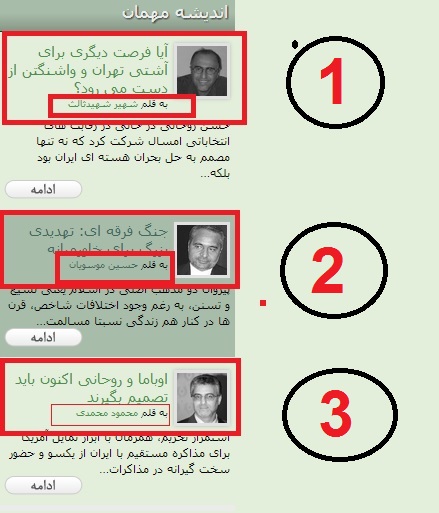 كشفت هيئت التحرير في موقع بارسي الجديد ومن خلال تفضيل ونشركتابات اكبرثلاثة عناصر نشطة تابعة للوبي الإيراني في الخارج كشفت عن توجهها المتناسق مع النظام الإيراني حيث نجد أن نشر كتابات عناصر النظام ومنهم “سيد حسين موسويان” و”شهير شهيد ثالث” ومحمود محمدي تصدرا صفحات موقع شرق بارسي الجديد.