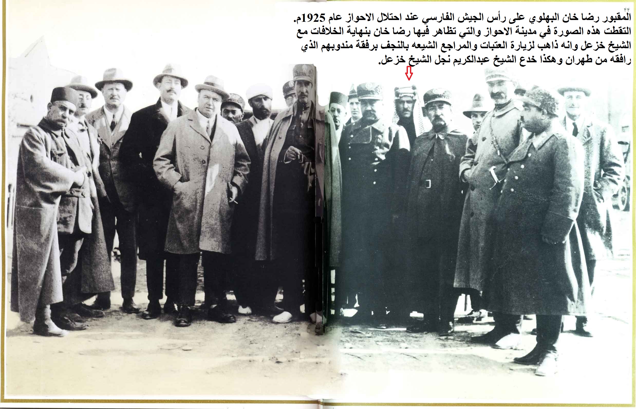 فالشيخ خزعل الذي خاطب بكل جرأة جنرالات الجيش البريطاني بعد الانتهاء من العرض العسكري الذي قامت به القوات البريطانية نهاية عام 1916م فی المحمرة وقال :«من الجيّد أن نرى هذه العلوم من خلال العرض العسكري لكننا نتطلع ونتمنى أن تحل علوم السلام مكان علوم الحرب والدمار في المستقبل» يصبح فيما بعد اسيرا لدى جندي فارسي امي لا يجيد القرأة والكتابة أتى به الانجليز بعد ما كان يعمل سايس خيل في السفارة الهولندية بطهران وتحتل بلاد الاحواز ويقهر شعبها من قبل الفرس لأن أميرها كان يتطلع ويتمنى أن تحل علوم السلام مكان علوم الحرب والدمار!.شاهد(1) – (2) – (3) – (4) – (5).