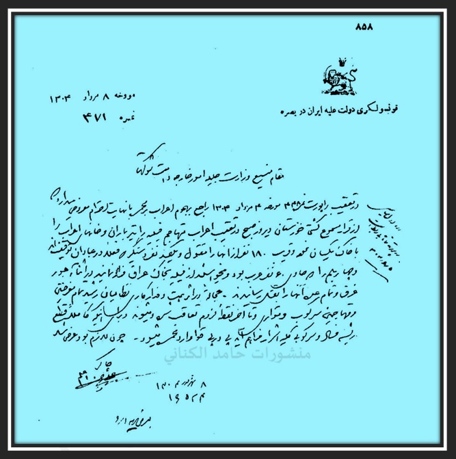 تعود هذه الوثيقة لمنشورات وزارة الخارجية الايرانية والتي ارسلها القنصل الفارسي بمدينة البصرة العراقية لوزارة الخارجية الايرانية في طهران،حسب الظاهر من الوثيقة كان القنصل الفارسي يدير الهجوم العسكري ضد الاحوازيين وبالتنسيق مع المستعمر الانجليزي من الاراضي العراقية،جاء فيها ما يلي«تعقيبا لتقريركم رقم 448 الصادر يوم الخامس والعشرين من جولاي 1925م حول هجوم الاعراب على المحمرة،افيدكم وبكل احترام وحسب ما وصلنا أن باخرة خوزستان طاردت الاعراب المهاجمين وقصفت منطقة الفيلية بشدة (منطقة تابعة للمحمرة وعلى ضفاف نهر كارون وفيها قصر الامير الشيخ خزعل بن جابر وقصور ومبان حكومية احوازية) جتى دمرت وسويّت منازل الاعراب بالكامل وقتل حوالي 180 شخص وتم القاء القبض على 100 شخص آخر جميعهم محتجزين لدى قواتنا في عبادان حاليا،كما اغرقنا أربعة زوارق وفيها 60 شخص كانت متجهة من الفيلية باتجاه الاراضي العراقية على الساحل الثاني من شط العرب وقتل كل من فيها».