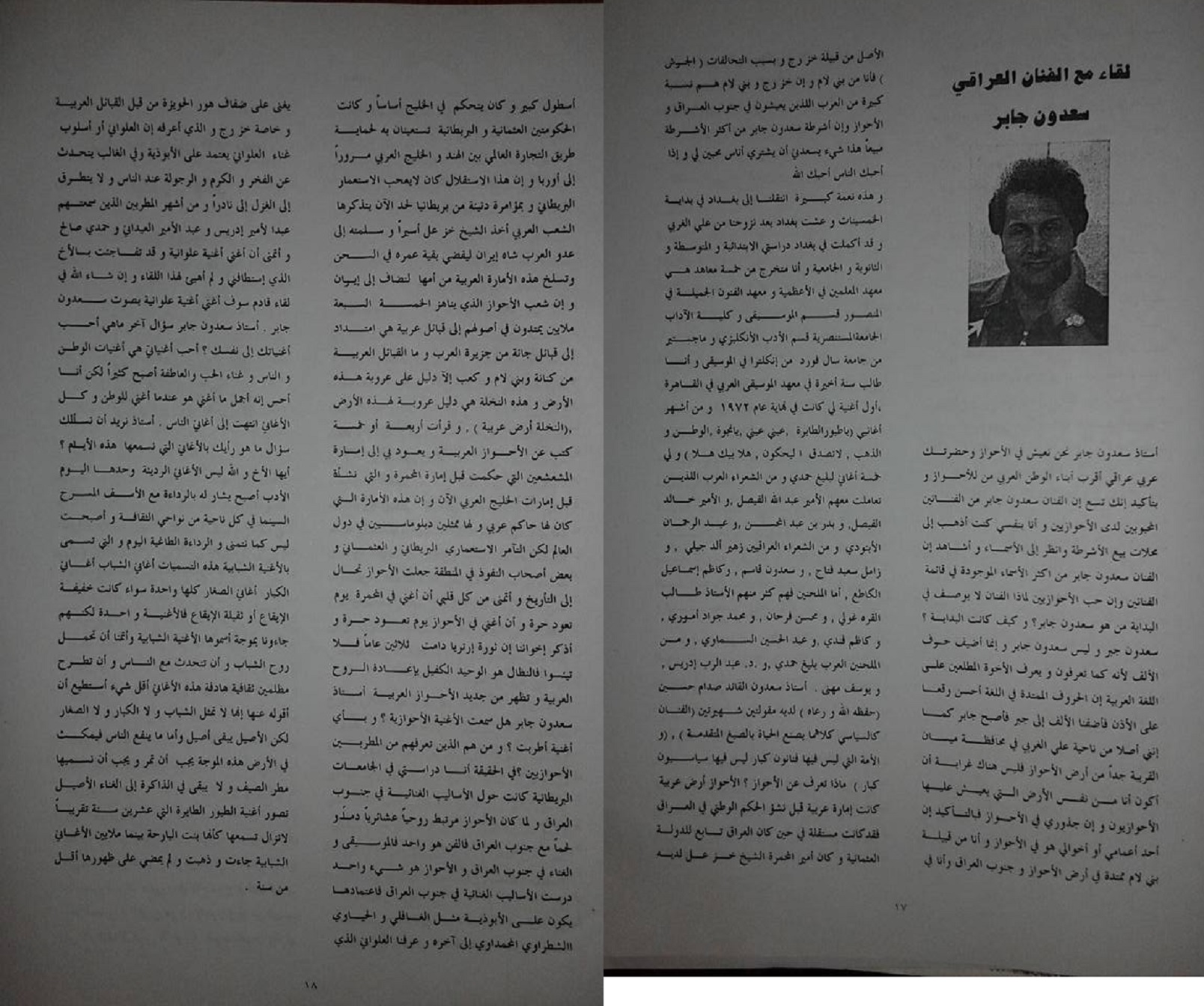حوار أجراه المناضل فؤاد سلسبيل الفيصلي مع الفنان العراقي سعدون جابر كانت مجلة الاحواز التابعة للجبهة العربية لتحرير الاحواز قد نشرته في صفحاتها .. اللقاء فيه بصمة احوازية ارتقى من خلاله الاخ فؤاد سلسبيل بذكاء وتصرف إلى ربط مشوق .. اللقاء هو الحكم ..نصار الشيخ خزعل