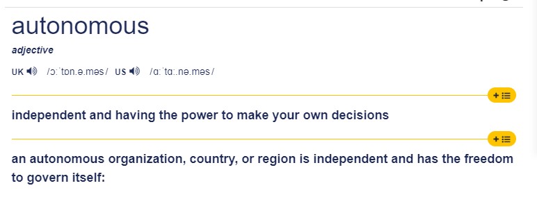 للتنويه فقط: راسلني أحد الأخوة موضحا ان كلمة (autonomous) تعني الحكم الذاتي وليس الاستقلال وعند البحث عن الترجمة الصحيحة لهذه الكلمة الانجليزية وجدت ان مفهوم هذه الكلمة في جميع المعاجم يعني الاستقلال إلا في اللغة الفارسية حيث المفهوم يكون (الحكم الذاتي) ولكن القائمة لا تتعلق ببلاد فارس لكي نأخذ مفوم الكلمة في اللغة الفارسية، كما أدرج هنا صورة عن صفحة لمعنى كلمة (autonomous) وفق قاموس كامبريدج الانجليزي المعتمد.