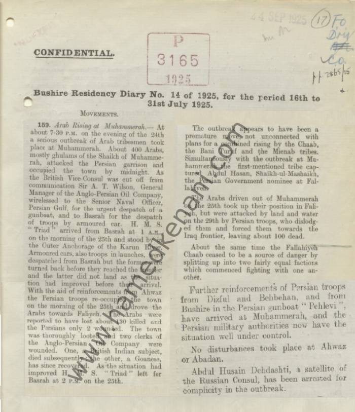لندن- موقع كارون الثقافي- بحث وترجمة وتدوين حامد الكناني- تعود هذه الوثيقة لملخصات إخبارية للمقيمية البريطانية في ميناء ابو شهر ١٩٢١-١٩٢٥ ومسجلة في سجلات وزارة الخارجية البريطانية ومنشورة على موقع أرشيف المكتبة الرقمية القطرية.
