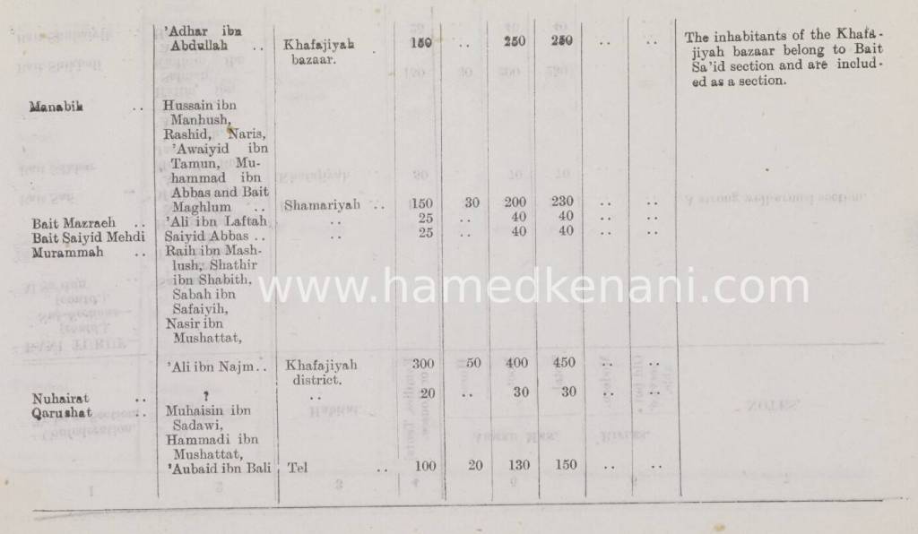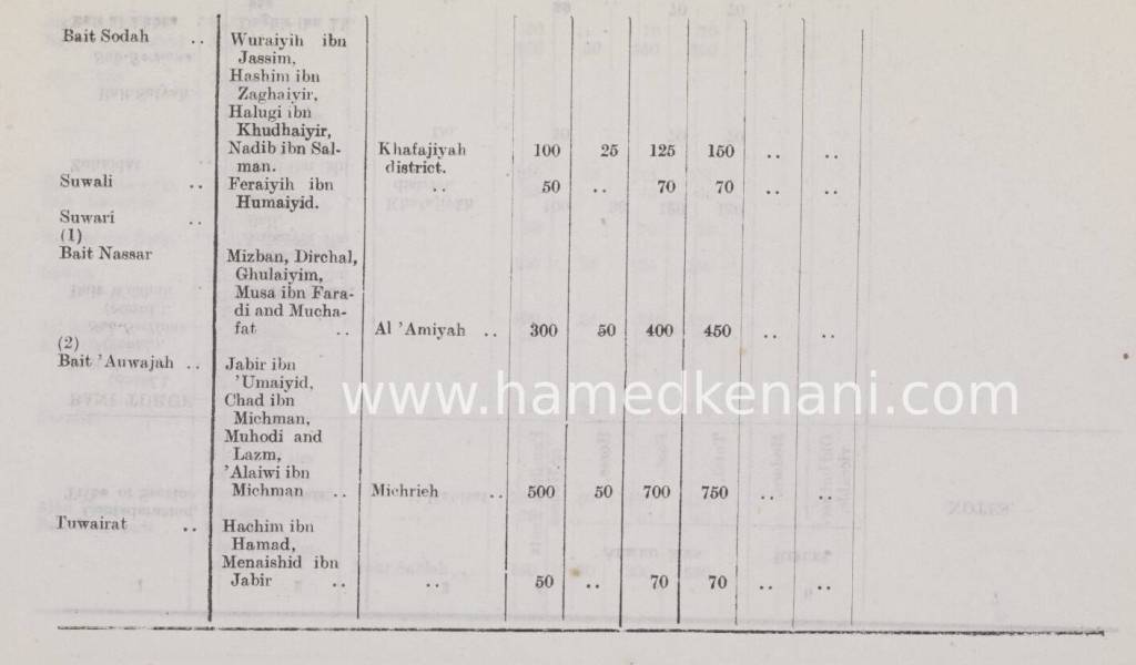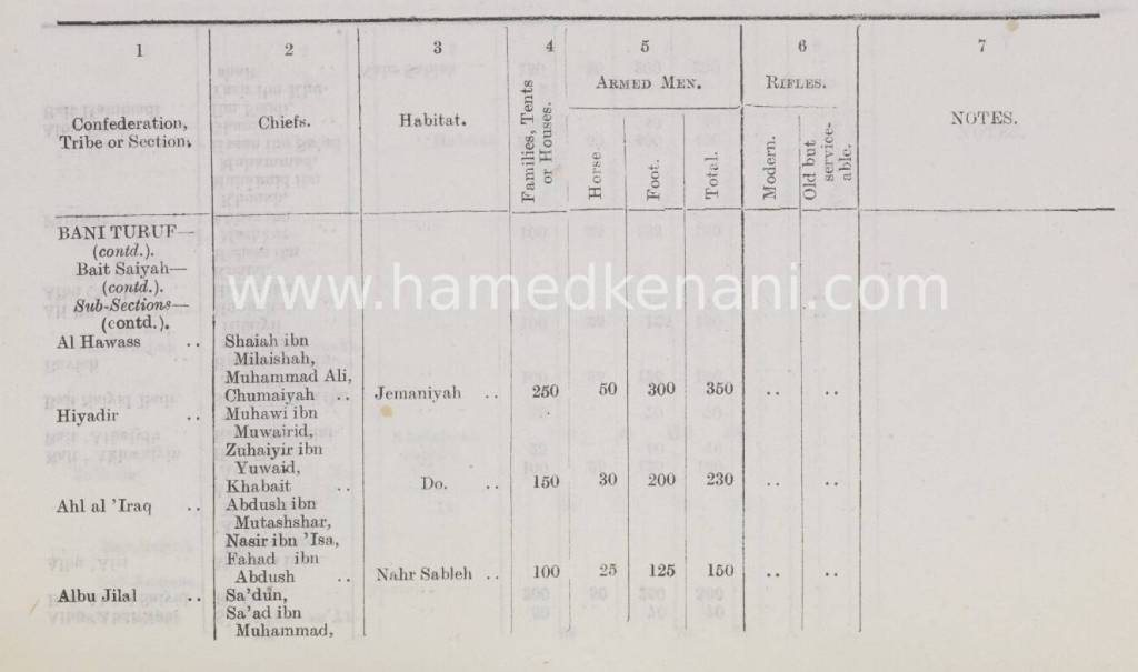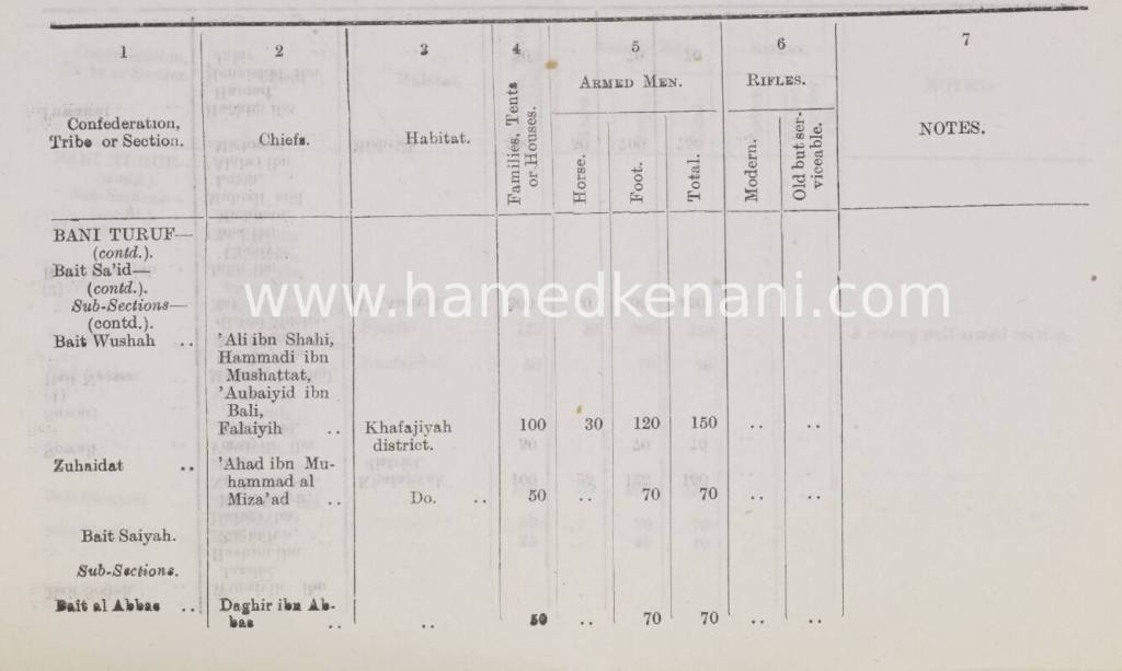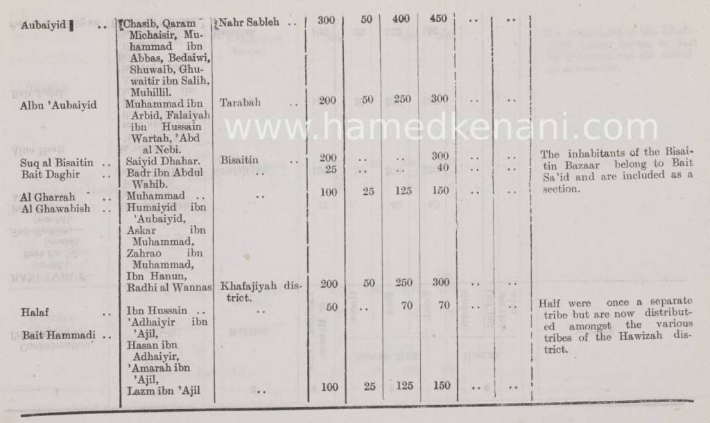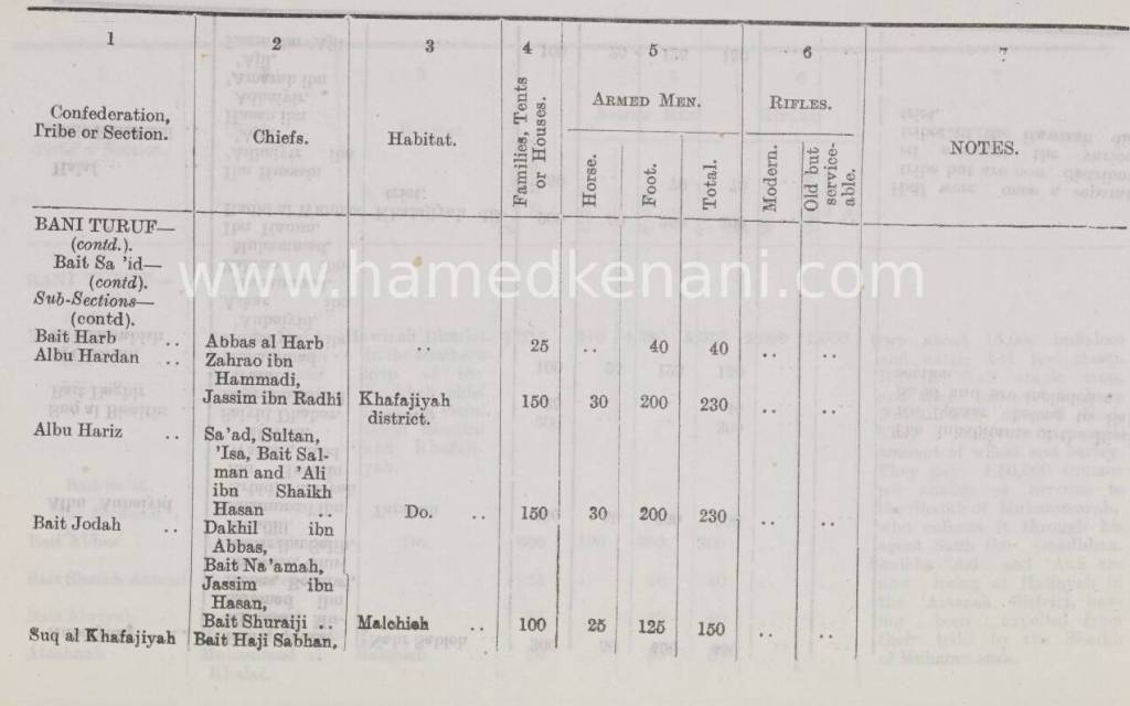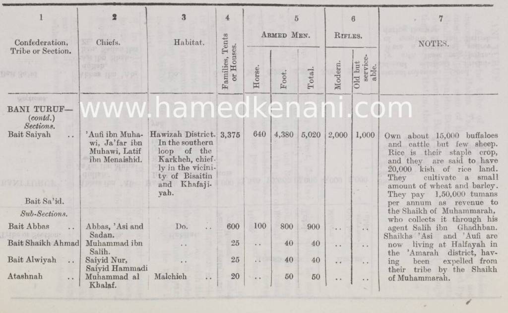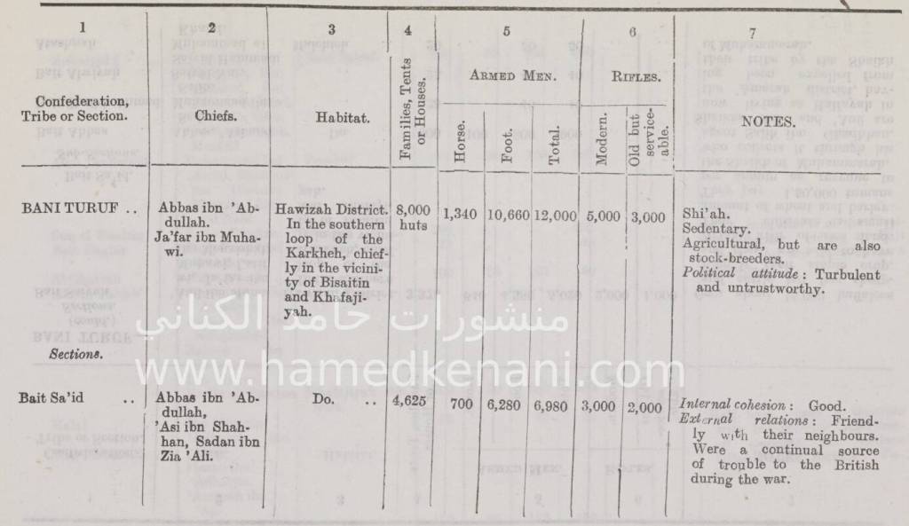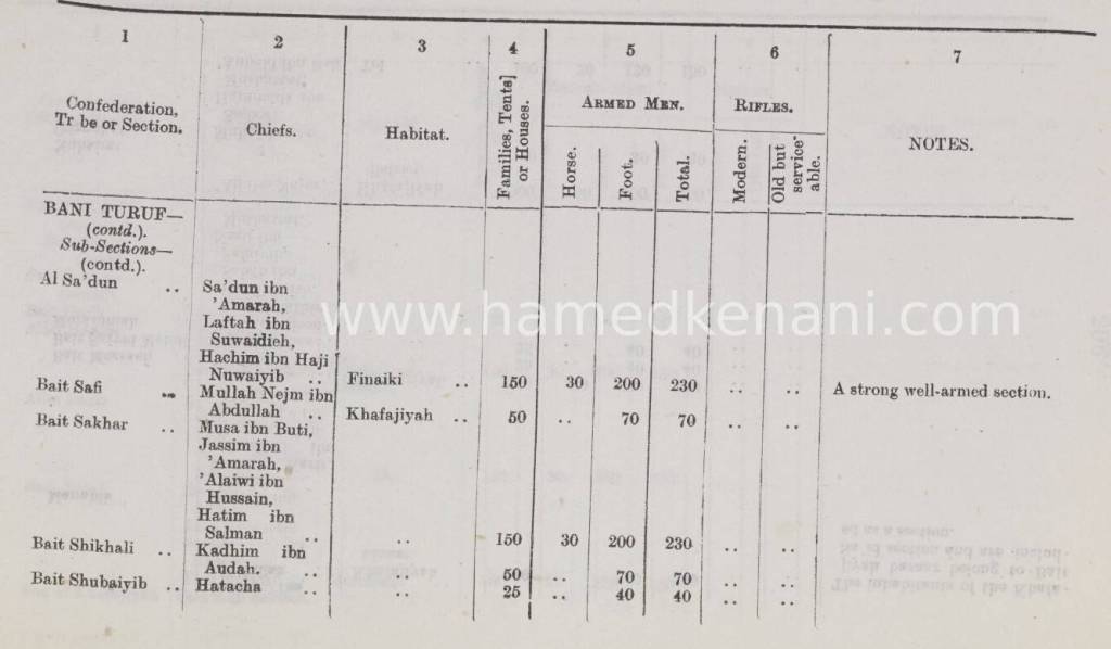 من شيوخها البارزين عاصي وعوفي استسلموا هدايا كبيرة قدمها أثناء الحرب محمد باشا داغستاني ونفاهم شيخ المحمرة من موطن القبيلة. إنهم يعيشون الآن معًا في الحلفاية في منطقة العمارة في العراق، وعلى استعداد دائمًا لكسب حظوة لدى الحكومة البريطانية وشيخ المحمرة حتى يمكن إعادتهم إلى مناصبهم السابقة بصفتهم شيخان بارزان لبيوت بني طرف ، حيث القبيلة منقسمة.