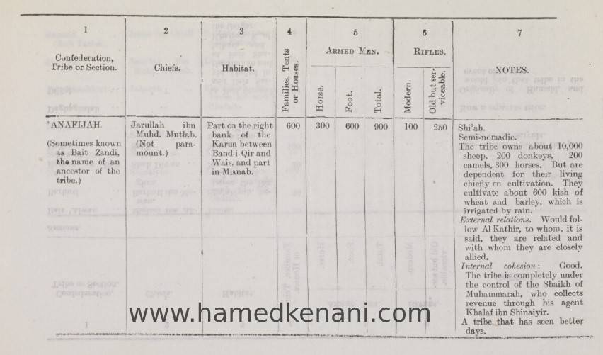 نظرا لأهمية المعلومات الواردة في هذه التقرير احاول اعادة نشرها مترجمة باللغة العربية وفي حلقات عدة وجعلها متوفرة للكتاب والباحثين في الشأن الأحوازي. في هذه الحلقة ووفق ترتيب الابجدية الانجليزية نتناول قبيلة (العنافجة) وهي قبيلة عربية تقطن اليوم شمال مدينة الأحواز بين منطقتي بنيد القار (بند قير) وويس.