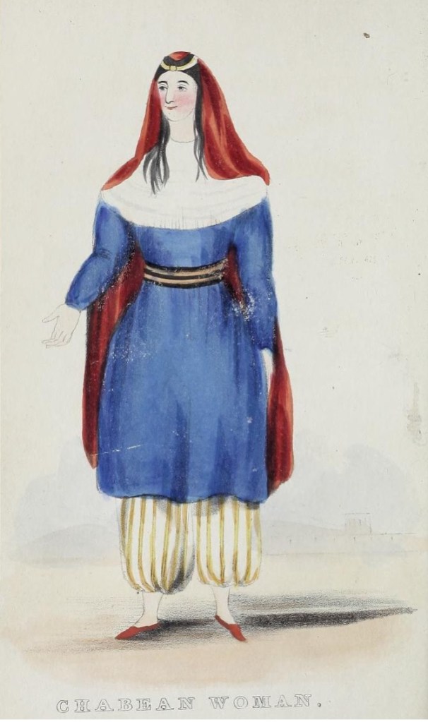 الزي العربي الرائج لدى الشباب من الرجال والنساء في الإمارة الكعبية عام 1831 والموصوف بـ “زي الرجل الكعبي” و “زي المرأة الكعبية”.