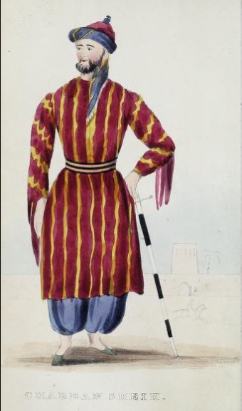 لندن- موقع كارون الثقافي- حامد الكناني- يرتدون القباء، أي البشت وهو ثوب يلبس فَوق الثِّيَاب أَو الْقَمِيص ويتمنطق عَلَيْهِ، أو قميص طويل من الخام الأخضر (زبون- صاية- كندورة) ، وحزام و سروال ، والصندل (النعال) وعمامة أرجوانية من القماش وهي نفس العمامة العربية. كما يرتدي الشيوخ فساتين مطرزة باللون القرمزي والذهبي في المناسبات غير العادية ، ولكن في الأيام العادية ، يرتدون ملابس باللون القرمزي المتنوع والمزركش بالخيوط الذهبية. لقد رفضوا عمومًا جميع الهدايا التي قدمتها لهم ، خوفًا من الإساءة إلى أميرهم القوي ؛ ومع ذلك ، فإنهم ، في كل بلدة تقريبًا ، يلمحون إلى المسدس أو الأسلحة النارية ستكون مقبولة.