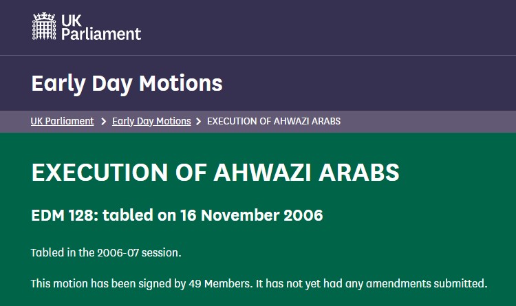 “يشير البرلمان البريطاني إلى الاضطهاد الممنهج لعرب الأحواز في منطقة خوزستان، جنوب غرب إيران، من قبل السلطات الحاكمة في طهران ؛ يلاحظ كذلك أن 10 من عرب الأحواز هم علي مطيري ، وعبدالله السليماني ، وعبد الرضا سنواتي (زرقاني) ، وقاسم سلامات ، ومحمد كعب بور ، وعبد الأمير فرج الله كعب ، وعلي رضا عساكرة ، وماجد البوغبيش ، وخلف خضيري ، ومالك بني تميم ، حُكم عليهم بالإعدام ؛ تدعم منظمة العفو الدولية وهيومن رايتس ووتش في بيناتهما شكوى العدالة في إيران التي تؤكد أن العديد من المتهمين من عرب الأحواز لم تتح لهم الفرصة لمقابلة محاميهم قبل بدء البت في قضاياهم ، وقد خاضوا محاكمات سرية لمدة يوم واحد دون شهود ، ودونت لهم اعترافات كاذبة انتُزعت تحت التعذيب ؛ وتدعو الحكومة الإيرانية إلى احترام حقوق الإنسان لجميع شعوبها وتخفيف عقوبة الإعدام في هذه الحالات.”
