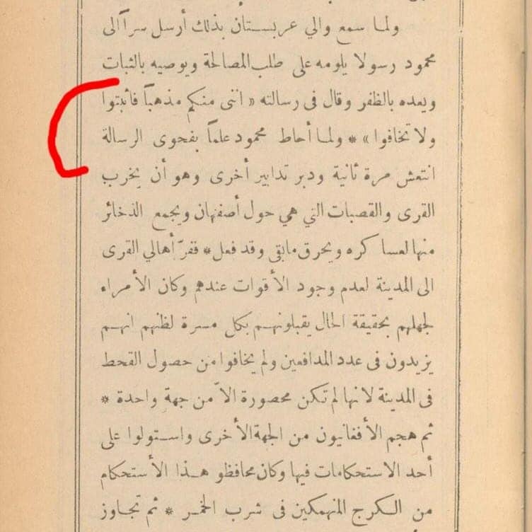 “..ولما سمع والي عربستان بذلك أرسل سرا الى محمود رسولا يلومه على طلب المصالحة ويوصيه بالثبات ويعده بالظفر وقال في رسالته « اننى منكم مذهبا فاثبتوا ولا تخافوا» ولما أحاط محمود علما بفحوى الرسالة انتعش مرة ثانية ودبر تدابير أخرى وهو أن يخرب القرى والقصبات التي هي حول أصفهان ويجمع الذخائر منها لعساكره ويحرق مابقى وقد فعل..”.