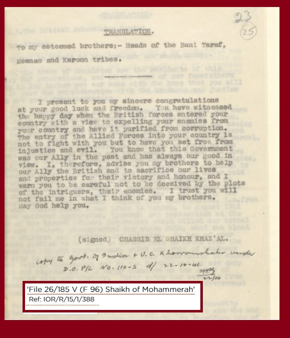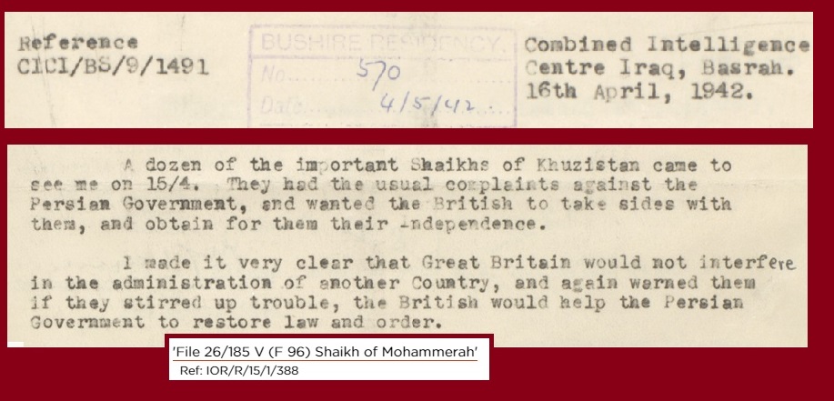 اما القنصل البريطاني في مدينة البصرة العراقية ارسل بتاريخ 16 ابريل 1942 رسالة إلى الحكومة البريطانية والسفارات والقنصليات البريطانية في المنطقة تشير إلى ان عشرات الشيوخ والزعماء الأحوازيين ذهبوا لمقابلته في البصرة مطالبين السلطات البريطانية بتخليصهم من الاحتلال الإيراني ودعم استقلال عربستان. جاء في الرسالة:
