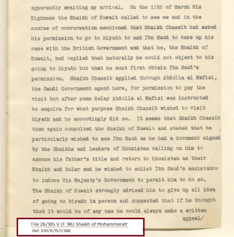 لندن- موقع كارون الثقافي- حامد الكناني- تشير هذه الوثيقة الموجودة في الأرشيف الوطني البريطاني وهي عبارة عن تقرير دبلوماسي للسفير البريطاني في الكويت، إلى جهود الشيخ كاسب بن خزعل نيابة عن شيوح ووجها الشعب العربي الأحوازي سنة 1942 لتخليص العرب من الهيمنة الفارسية بالطرق الدبلوماسية والسلمية. ومحاولتة الذهاب إلى عاصمة المملكة العربية السعودية، الرياض، ومقابلة الملك عبدالعزيز بن سعود، من أجل طلب وساطته لدى الانجليز، والحصول على دعمه لعودة الحكم العربي لعربستان. لكن وكما يبدو ان الفكرة تم وأدها في أول محطة إقليمية لجولة الشيخ كاسب وهي الكويت، حيث اصطدمت قضية عربستان مرة أخرى بمصالح إقليمة ودولية.