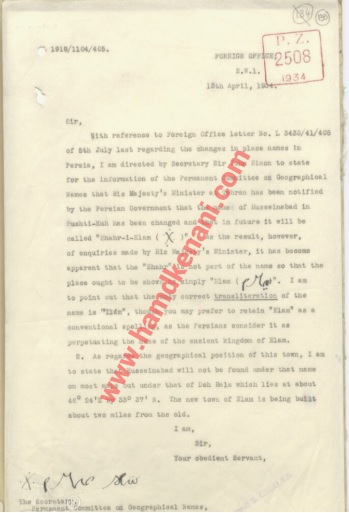 “بالإشارة إلى خطاب وزارة الخارجية رقم L 3433/41/405 الصادر في 5 يوليو الماضي [1934] بشأن التغييرات في أسماء الأماكن في بلاد فارس ، وجهني السكرتير السير جون سيمون لأذكر معلومات اللجنة الدائمة المعنية بالأسماء الجغرافية التي قدمها صاحب الجلالة. تم إخطار الوزير في طهران من قبل الحكومة الفارسية بأن اسم حسين آباد في بشتكوه قد تم تغييره وأنه في المستقبل سوف يطلق عليه “شهر – عيلام”. ومع ذلك ، ونتيجة للاستفسارات التي أجراها وزير جلالة الملك ، فقد أصبح من الواضح أن “الشهر” ليس جزءًا من الاسم ، لذا يجب إظهار المكان على أنه “Elam”. للتنويه فقط؛التحويل الصوتي الصحيح للاسم هو “إيلام” ، على الرغم من أنك قد تفضل الاحتفاظ بكلمة “عيلام”، حيث يعتبرها الفرس استمرارًا اسم مملكة عيلام القديمة.