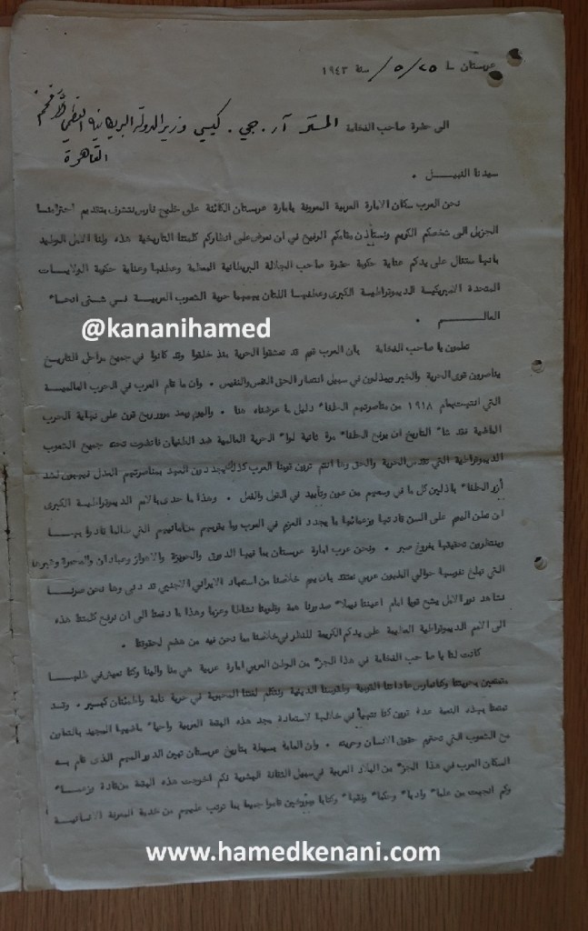 اليكم نص هذه الرسالة التاريخية التي وجهت لوزير الدولة في الحكومة البريطانية من قبل زعماء ومشايخ وشخصيات عربية احوازية وتحمل اسمائهم وتوايقعهم واختامهم. الرسالة يبدو قدمت للسفارة البريطانية في القاهرة وتحمل تاريخ 25 مايو (آيار) 1943 أي قبل عام تقريبا من انتشار الشائعة التي تقول ” أن البريطانيين يقترحون إنشاء دولة عربية مستقلة في جنوب بلاد فارس”.: