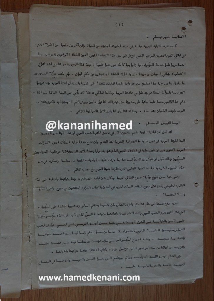 كانت لنا يا صاحب الفخامة في هذا الجزء من الوطن العربي امارة عربية هي منا والينا وكنا نعيش في ظلها متمتعين بحريتنا وكنا نمارس عاداتنا القومية وطقوسنا الدينية ونتكلم لغتنا المحبوبة في حرية تامة واطمئنان كبير. وقد تمتعنا بهذه النعمة عدة قرون كنا نتهيأ من خلالها لاستعادة مجد هذه البقعة العربية وأحياء ماضيها المجيد بالتعاون مع الشعوب التي تحترم حقوق الانسان وحريته. وان المامة بسيطة بتاريخ عربستان تبين الدور المهم الذي قام به السكان العرب في هذا الجزء من البلاد العربية في سبيل الثقافة البشرية فكم أخرجت هذه البقعة من قادة وزعماء وكم أنجبت من علماء وادباء وحكماء وفقهاء وكتابا ومؤرخين قاموا جميعاً بما ترتب عليهم من خدمة المعرفة الإنسانية خير مقام.