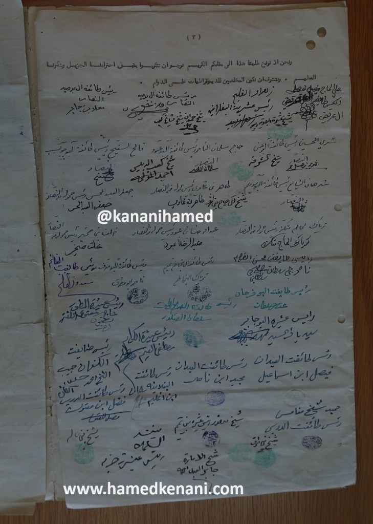 وعلى هذا فنحن شيوخ ورؤساء جميع القبائل العربية وسكان مدن أمارة عربستان قد وقعنا بتواقيعنا واختامنا على هذا الطلب التاريخي ونحن نمثل جميع طبقات السكان العرب في المدن والأرياف والمزارع المنتشرين في جميع نواحي الامارة بلا استثناء.