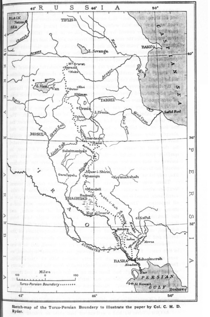 “إن الحدود التركية الفارسية، التي سأصف ترسيمها في عامي 1913 و1914، هي حدود لها ماض. ومن اللافت للنظر، إن لم يكن لسبب آخر، أن الجهود الرئيسية الثلاث لتسويتها قد انقطعت كل منها بسبب حرب أوروبية كبرى. ودون الخوض كثيرًا في العصور البعيدة، فإن الحدود التركية الفارسية افترضت موقعها الحالي تقريبًا في أوائل القرن السابع عشر؛ وكانت الغارات الحدودية من كلا الجانبين تحدث باستمرار، كما كان متوقعًا في بلد تسكنه قبائل (عربية) مستقلة ومحاربة بعيدة كل البعد عن النفوذ الخفيف الذي يمكن أن تمارسه عليهم إما القسطنطينية أو طهران. أشك في وجود أي حرص من جانب القبائل نفسها على إقامة أي تسوية عامة للحدود في أي وقت؛ فهناك الكثير من المرح والحرية في خط الغارات عندما لا يعرف أحد بالضبط أين تقع الحدود.