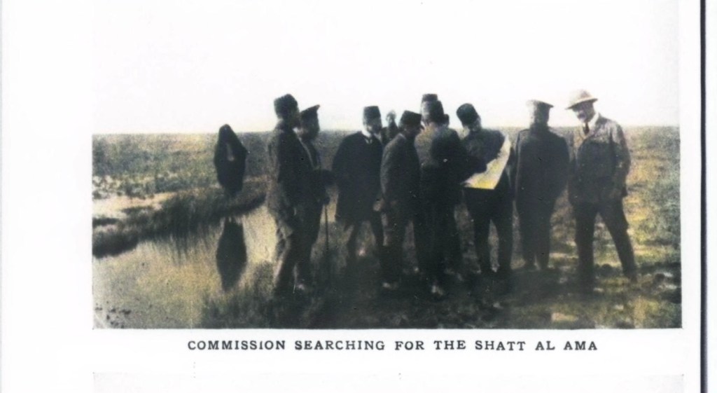 باستثناء المناطق التي كانت الحدود فيها تمتد على طول معالم طبيعية محددة جيدًا لا يمكن الشك فيها. من مكان اجتماعنا في المحمرة بدأنا عملية ترسيم الحدود بالإبحار على طول شط العرب إلى الفاو فقط للنظر إلى الحدود التي كانت تقع عند خط المد العالي على الضفة اليسرى. شاركت باخرة مرمريس بعد ذلك في القتال على النهر في عام 1914، عندما غرقت. ثم تابعنا بعد ذلك مراسم رسمية كبيرة لنصب العمود رقم 1 حيث تترك الحدود النهر بين المحمرة والبصرة. للوصول إلى المكان كان علينا أن نصعد إلى جدول صغير في “بلام” كبيرة، وندق أوتادًا لبيان موقع العمود رقم 1 وجاره الذي كان مؤشرًا للاتجاه، ثم يمتد الحد في خط مستقيم إلى جوار كشكي بصري. ثم انفضنا لنشارك في وليمة عربية فاخرة أعدها لنا الشيخ، ولم نتمكن نحن الذين نتمتع بقدر أكبر من الهضم من أن نفيها حقها، وذلك بسبب غلام أسود كان يتجول بين الأطباق ويقطع بيديه الذبائح بالكامل التي كانت تشكل الوجبة الرئيسية في قائمة الطعام.