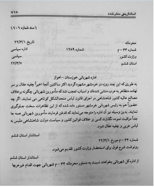 تشير إحدى الوثائق الفارسية الصادرة عام 1943 – مع بدايات حكم محمد رضا بهلوي، نجل رضا خان – إلى أن النظام الجديد واصل نهج والده في قمع العرب، رغم وعود طهران في مؤتمر الحلفاء بمنح الشعوب غير الفارسية، كالعرب والأتراك والأكراد، بعضًا من الحكم الذاتي.