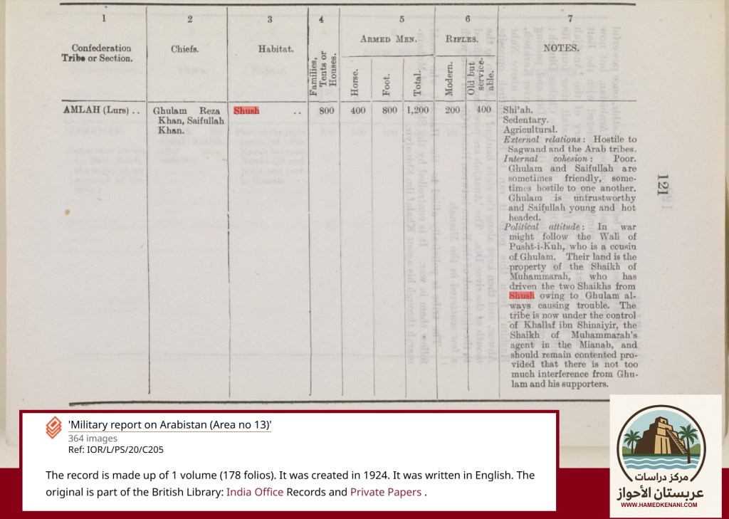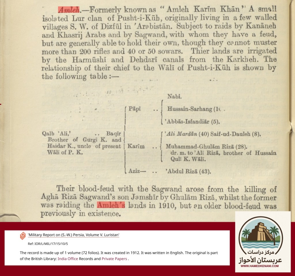 في تقرير عسكري سري صادر عام 1924 عن المنطقة رقم ثلاثة عشر، تحديدًا في الصفحة 21، ورد وصف مفصل للعملة ومحيطها، الواقعة ضمن مدينة السوس، حيث يسلط الضوء على قبيلة العملة (Amleh)، التي كانت تُعرف سابقًا باسم “عملة كريم خان”. جاء في التقرير ما نصه: “تنتمي هذه القبيلة إلى فخذ صغير ومعزول من قومية اللور، في بشتكوه (Pusht-i-Kuh). بعد انتقالهم لشال عربستان كانت مساكن أفراد هذه القبيلة في الأصل مجموعة قليلة من القرى المسورة، تقع إلى الجنوب الغربي من مدينة دزفول في منطقة عربستان.