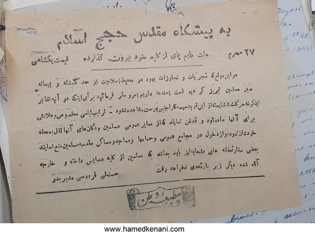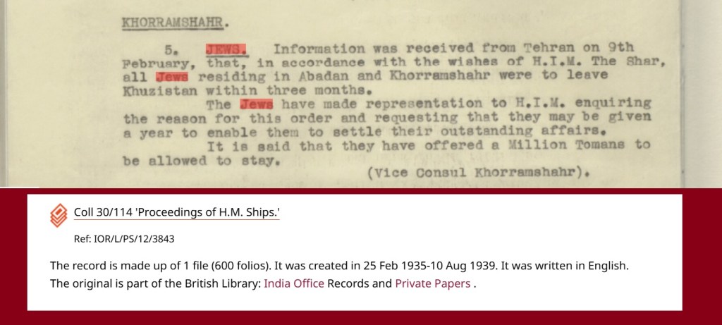 في عام 1938، شهدت الأحواز حدثًا بارزًا يتضمن إصدار أوامر بطرد اليهود من قبل السلطات الفارسية، ما أثار قلقًا واسع النطاق لدى المجتمعات المحلية والدولية. يشير محتوى الوثائق أدناه إلى ان الأحداث المتعلقة بهذا الطرد، وخاصة المحادثات بين المسؤولين الحكوميين، وتأثيرات ذلك على اليهود الأحوازيين والعراقيين.