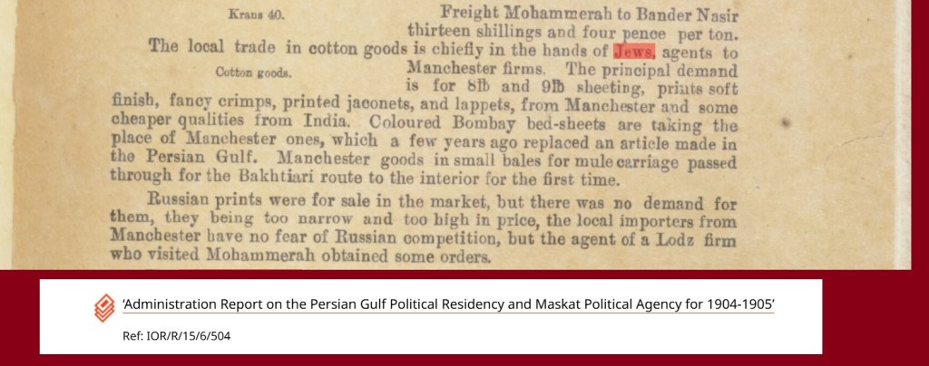 تسجل التقارير البريطانية لعامي 1904–1905 تفاصيل دقيقة عن النشاط التجاري في المحمرة، وتبرز الدور المحوري لليهود في الاقتصاد المحلي. فقد كانت تجارة القطن المحلية متركزة أساسًا في أيديهم، حيث عملوا كوكلاء لشركات مانشستر البريطانية. وكان الطلب الأساسي على منتجات مثل الملاءات (٨ و٩ إف بي)، والمطبوعات ذات اللمسة الناعمة، والأقمشة المزخرفة الفاخرة، والجاكونيتات المطبوعة، والبطانات، إضافة إلى الأنواع الأرخص المستوردة من الهند.
