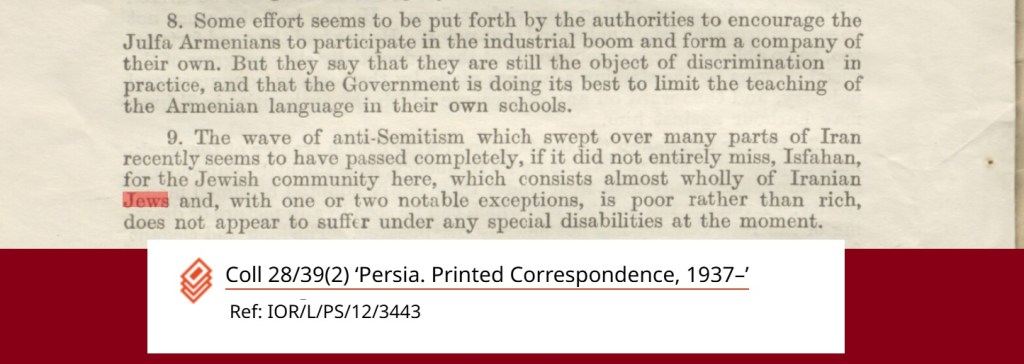 ٩. تشير الوثائق إلى أن موجة معاداة السامية، التي اجتاحت أجزاء كثيرة من إيران مؤخرًا، لم تطل أصفهان بشكل ملحوظ. ويبدو أن الجالية اليهودية هناك – والتي تتكون بالكامل تقريبًا من يهود محليين (إيرانيين)، باستثناء واحد أو اثنين – جالية فقيرة لا تملك ثروة تُذكر، ولا يبدو أنها تعاني في الوقت الحالي من قيود أو إعاقات خاصة.