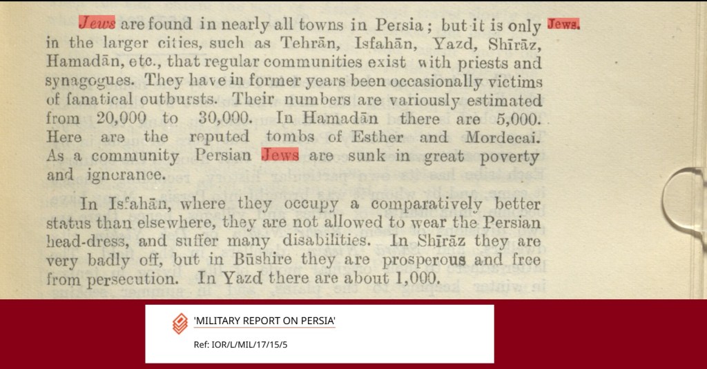 وجاء في الوثائق ما نصه: يوجد اليهود في معظم مدن بلاد فارس، لكن التجمعات المنتظمة التي تضم كهنة ومعابد يهودية تتركز فقط في المدن الكبرى مثل طهران وأصفهان ويزد وشيراز وهمدان وغيرها. وقد كانوا خلال السنوات الماضية عرضة أحيانًا لاضطرابات ذات طابع ديني متعصب.