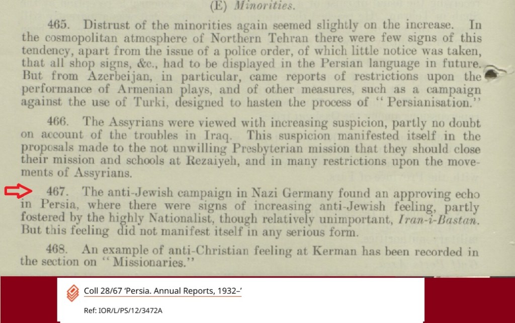 جاء في مجموعة التقارير البريطانية السرية عن بلاد فارس لعام 1937 – وهي الفترة التي بدأ فيها رضا خان بهلوي، الذي نصّب نفسه بدعم بريطاني ملكًا على إيران عام 1925 – أن اليهود في أصفهان كانوا يعيشون أوضاعًا من الفقر والفاقة والتهميش التام. كما تضمنت التقارير النقاط التالية: