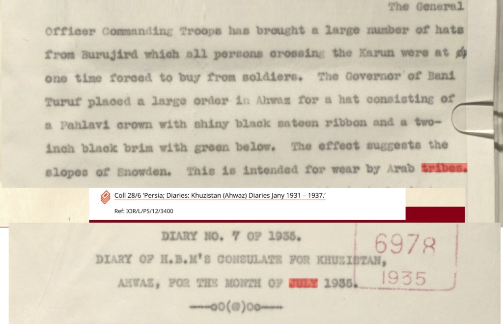“The General Officer Commanding Troops has brought a large number of hats from Burujird which all persons crossing the Karun were at one time forced to buy from soldiers. The Governor of Bani Turuf placed a large order in Ahwaz for a hat consisting of a Pahlavi crown with shiny black sateen ribbon and a two-inch black brim with green below. The effect suggests the slopes of Snowden. This is intended for wear by Arab tribes.”