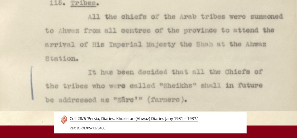 “All the chiefs of the Arab tribes were summoned to Ahwas from all centres of the province to attend the arrival of His Imperial Majesty the Shah at the Ahwaz Station. It has been decided that all the Chiefs of the tribes who were called ‘Sheikhs’ shall in future be addressed as ‘zare” (farmers).”