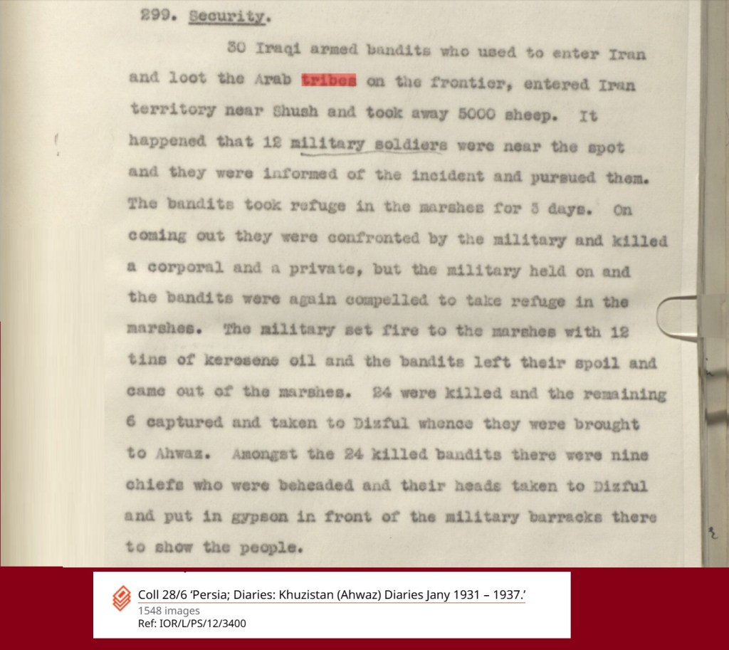 “30 Iraqi armed bandits who used to enter Iran and loot the Arab tribes on the frontier, entered Iran territory near Shush and took away 5000 sheep. It happened that 18 military soldiers were near the spot and they were informed of the incident and pursued them. The bandits took refuge in the marshes for 3 days. On coming out they were confronted by the military and killed a corporal and a private, but the military held on and the bandits were again compelled to take refuge in the marshes. The military set fire to the marshes with 12 tins of kerosene oil and the bandits left their spoil and came out of the marshes. 24 were killed and the remaining 6 captured and taken to Disful whence they were brought to Ahwaz. Amongst the 24 killed bandits there were nine chiefs who were beheaded and their heads taken to Dizful and put in gypson in front of the military barracks there to show the people.”