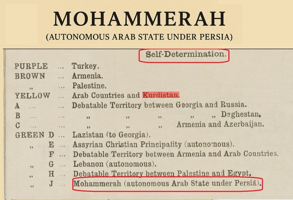 وفقاً للخرائط البريطانية عام 1918، تم تصنيف إمارة المحمرة كـ”دولة عربية تابعة لإيران” (Mohammerah – autonomous Arab State under Persia)، مما يعكس اعتراف المجتمع الدولي جزئياً بقدرتها على إدارة شؤونها الداخلية قبل أن تتعرض للسيطرة المركزية.