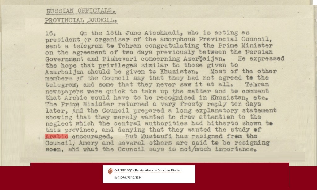 حاولت الحكومة الفارسية آنذاك أن توحي للدول العظمى بأنها شرعت في تطبيق المشروع، فأعلنت عن تشكيل مجلس محلي في الأحواز. وتشير الوثائق البريطانية إلى أن رئيس المجلس، المدعو “آتشكَدي” وهو فارسي الأصل، قد بعث ببرقية إلى رئيس الوزراء الإيراني مطالبًا بمنح العرب حقوقًا مماثلة لتلك التي تعهّدت الدولة الإيرانية بمنحها للأتراك في أذربيجان.