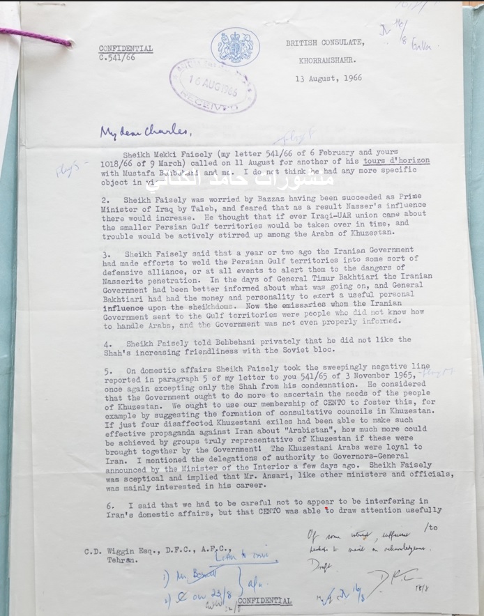 الوثيقة هي رسالة سرية (CONFIDENTIAL C.541/66) من هنري بارتليت، القنصل البريطاني في المحمّرة، موجهة إلى “تشارلز” (من السفارة البريطانية في طهران). تسجل اللقاء الذي جرى بين الشيخ مكي الفيصلي (نائب المحمّرة في البرلمان الإيراني) والقنصل البريطاني بحضور مصطفى بهبهاني.