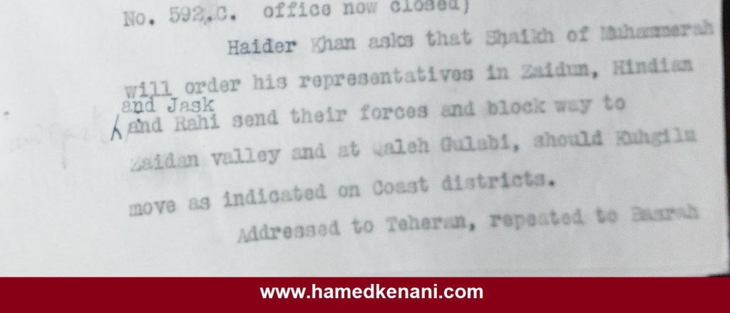 “يطلب حيدر خان أن يأمر شيخ المحمرة (الشيخ خزعل) ممثليه في زيدون، هنديان، جاسك، وراهي بإرسال قواتهم وقطع الطريق في وادي زيدون وفي قلعة كلابي، إذا تحركت كوهجيلوية كما ذُكر تجاه المناطق الساحلية.”