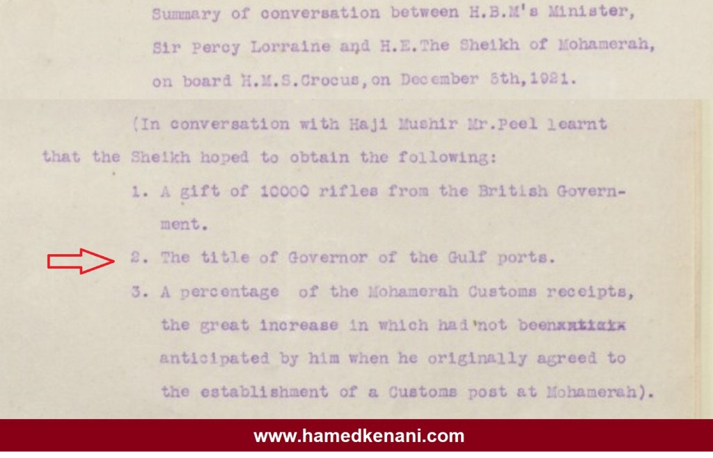وتكشف وثائق بريطانية أخرى عن طموحات الشيخ خزعل في توسيع نفوذه على كامل الموانئ الواقعة على الجانب الشرقي من الخليج العربي. ففي وثيقة بعنوان: “ملخص محادثة بين وزير صاحبة الجلالة، السير بيرسي لورين، وشيخ المحمرة، على متن السفينة إتش إم إس كروكس، في 5 ديسمبر 1921″، طالب الشيخ خزعل بالاعتراف البريطاني بلقبه الجديد “حاكم موانئ الخليج العربي”، إضافة إلى الحصول على هدية من بريطانيا تضم 10 آلاف بندقية حديثة وزيادة نسبته في موارد الجمارك التي تدار من قبل البلجيكيين في المحمرة.