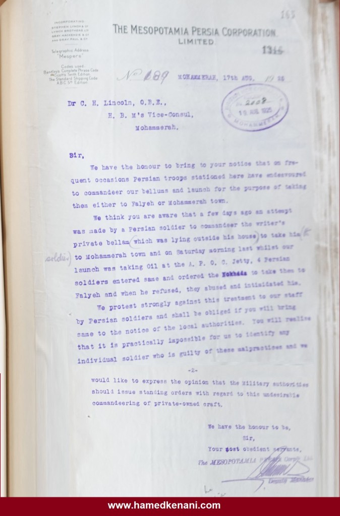 ونعتقد أنكم على علم بأنه قبل عدة أيام حاول أحد الجنود الفرس الاستيلاء على البلم (الزورق) الخاص بالكاتب، والذي كان راسياً أمام منزله، بقصد نقله إلى مدينة المحمّرة، كما أنه في صباح يوم السبت الماضي، وأثناء وجود زورقنا عند رصيف شركة النفط الأنجلو-فارسية (A.P.O.C.)، صعد أربعة جنود فرس إلى الزورق وأمروا النُخَذَة (ربّان المركب) بأن يقلّهم إلى فَليه، وعندما رفض، قاموا بإهانته وتهديده.