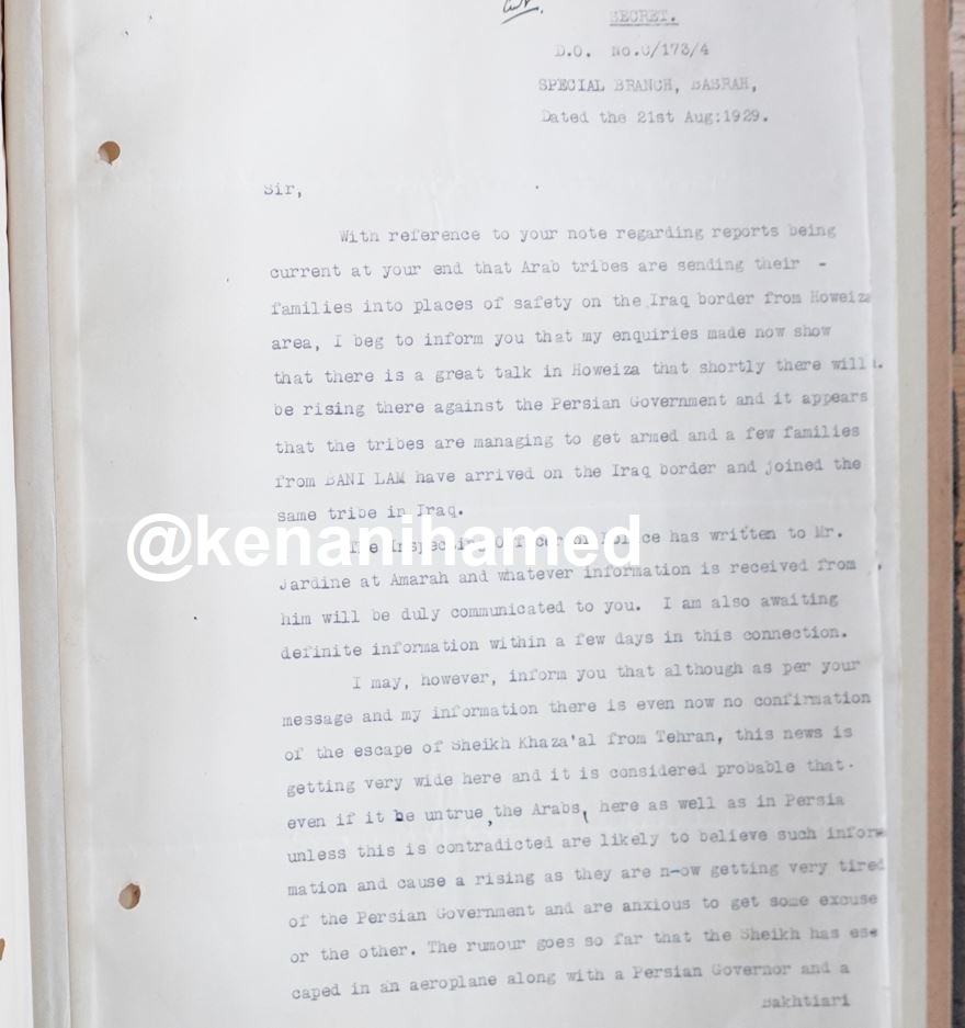 مركز دراسات عربستان الاحواز- حامد الكناني- في الحادي والعشرين من أغسطس عام 1929، أرسل ضابط مسؤول في الفرع الخاص بالبصرة برقية سرية إلى الكابتن إ. و. فليتشر، نائب القنصل البريطاني في المحمرة، بشأن أنباء تتعلق باستعداد وتحركات القبائل العربية في منطقة الحوَيْزة للثورة ضد السلطات الفارسية.