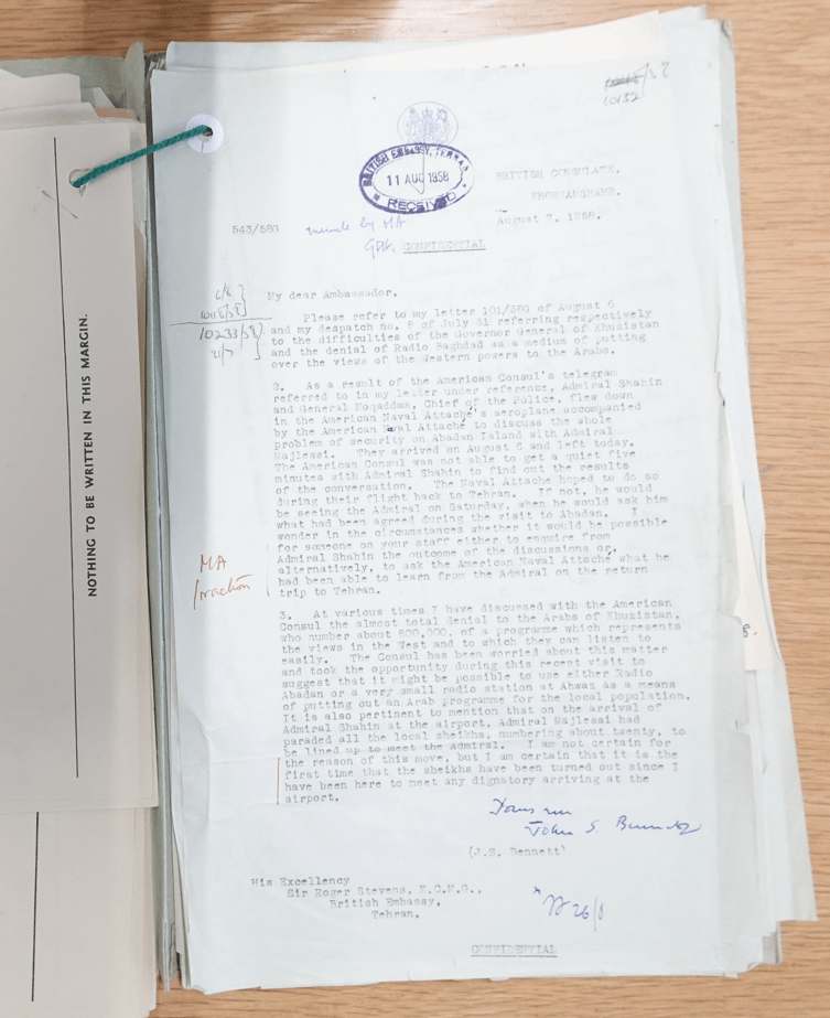 مركز دراسات عربستان الأحواز- حامد الكناني- تعود هذه الوثيقة إلى 7 آب/أغسطس 1958، وهي رسالة سرّية صادرة عن القنصلية البريطانية في المحمّرة، بعد أسابيع قليلة من انقلاب 14 تموز في العراق. تكشف الرسالة عن مستوى التنسيق البريطاني–الأمريكي مع السلطات الإيرانية بشأن الأوضاع الأمنية في عبادان وخوزستان، وعن القلق الغربي المتزايد من تأثير إذاعة بغداد والدعاية القومية العربية على العرب الأحوازيين.
