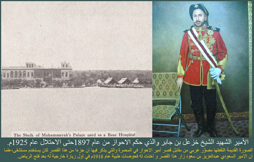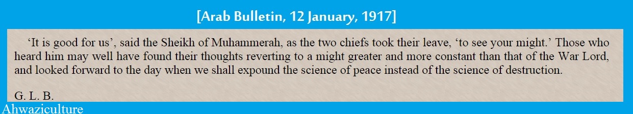 7هكذا قال أمير المحمرة عند توديع اثنان من كبار الضباط في الجيش البريطاني بعد العرض العسكري الذي قدموه في المحمرة في شهر نوامبر من عام 1916م :«من الجيّد أن نرى هذه العلوم من خلال العرض العسكري لكننا نتطلع ونتمنى أن تحل علوم السلام مكان علوم الحرب والدمار في المستقبل».