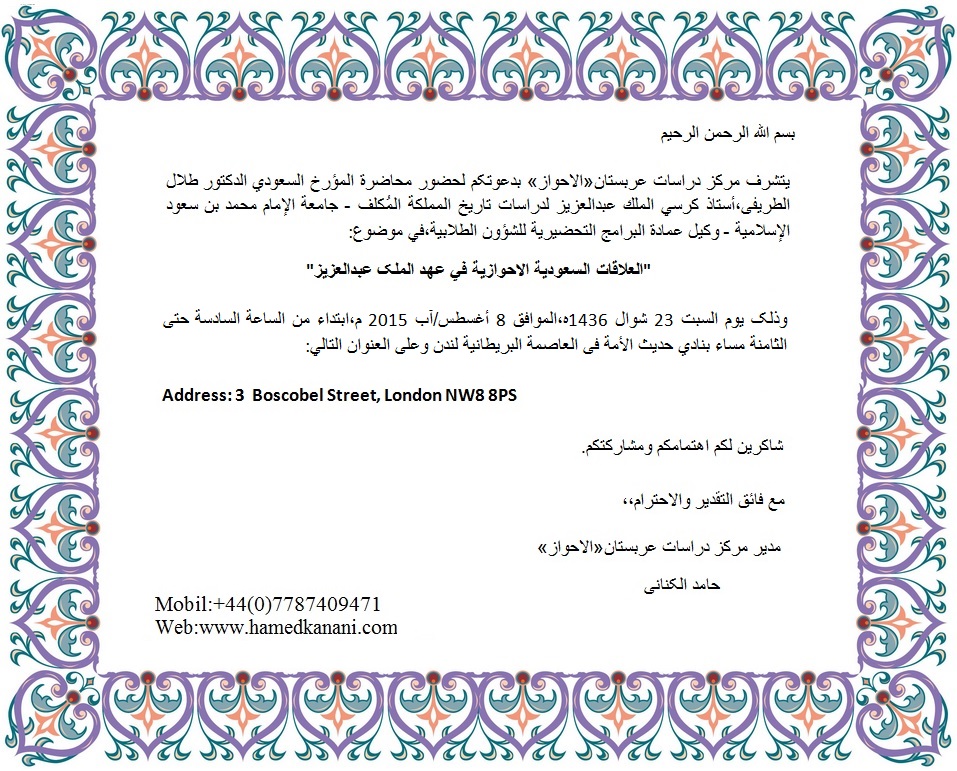 دعوة صادرة عن مركز دراسات عربستان«الاحواز» في لندن،لحضور محاضرة تأريخية حول “العلاقات السعودیة الاحوازیة في عهد الملک عبدالعزیز”