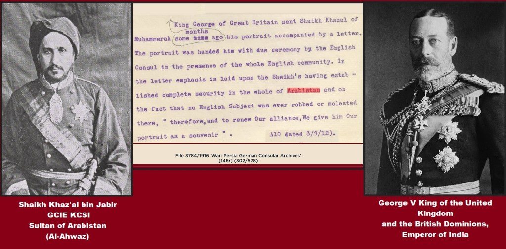 أرسل الملك جورج الخامس ملك بريطانيا العظمى عام 1912 صورته مرفقة برسالة إلى أمير الأحواز الشيخ خزعل بن جابر آل مرداو. وقد سلم القنصل الإنجليزي في مدينة المحمرة صورة الملك البريطاني ورسالته الخاصة إلى أمير الأحواز خلال مراسم احتفال اقيمت بهذه المناسبة بحضور الجالية البريطانية في المحمرة وأمراء من الأسرة الحاكمة وشخصيات أحوازية أخرى. وأكد الملك البريطاني في رسالته الخاصة على ان “عهد حكم الشيخ خزعل شهد أمنًا تامًا في جميع أنحاء عربستان (الأحواز) وفي الواقع لم يتعرض أي شخص إنجليزي للسرقة أو للإساءة هناك ، وبالتالي ، ولتجديد تحالفنا ، نقدم له صورتنا على أن تبقى هدية تذكارية”.