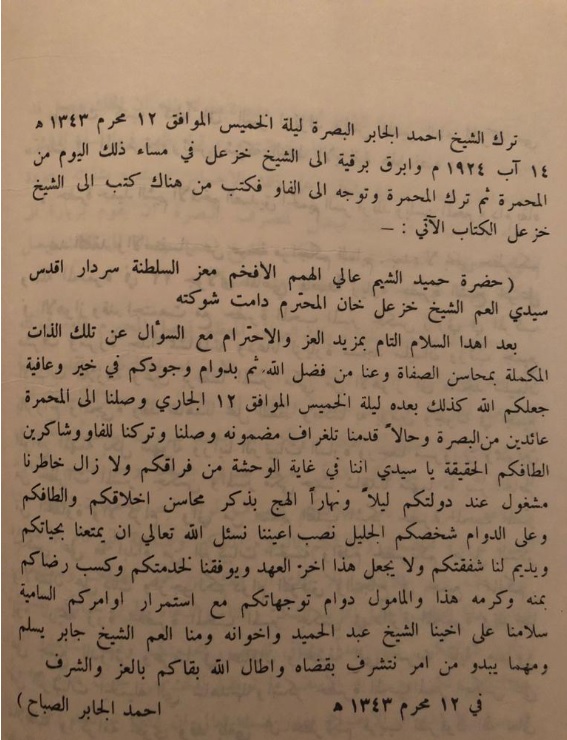 لندن- موقع كارون الثقافي- منشورات حامد الكناني- ترك الشيخ احمد الجابر البصرة ليلة الخميس الموافق ١٢ محرم ١٣٤٣ هـ ١٤ آب ١٩٢٤ م وابرق برقية الى الشيخ خزعل في مساء ذلك اليوم من المحمرة ثم ترك المحمرة وتوجه الى الفاو فكتب من هناك الى الشيخ خزعل الكتاب الآتي : –