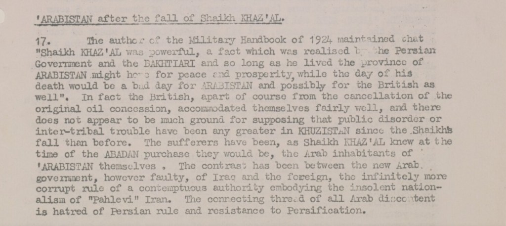 في الواقع البريطانيون ، بصرف النظر بالطبع عن إلغاء امتياز النفط الأصلي، تكيفوا بشكل جيد إلى حد ما، ولم يتصوروا أن هناك الكثير من الأسباب لافتراض أن الاضطرابات العامة أو الاضطرابات بين القبائل كانت أكبر في الأحواز (خوزستان بالفارسية) منذ سقوط الشيخ من ذي قبل.