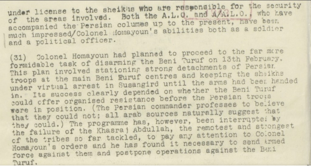 لندن- موقع كارون الثقافي- حامد الكناني- تعود هذه الفقرة لتقرير القنصلية البريطانية في الأحواز الصادر في فبراير عام 1943، أرشيف وزارة الخارجية البريطانية، يوميّات قنصلية. كانت اليوميات تقدَّم على أساسٍ نصف شهري من قبل القنصل البريطاني في الاحواز، ولكن تم تقديمها شهريًا لبعض الفترات. تتناول اليوميات فترة الحرب العالمية الثانية والاحتلال الأنجلو- سوفييتي لإيران، بدءًا من أغسطس 1941. تشير الفقرة لحملة السلطات الفارسية لنزع الاسلحة من القبائل العربية في الأحواز وذلك خلال فترة الفراغ الأمني الذي حصل نتيجة خلع رضاخان البهلوي (الدموي) وطرده من إيران والمجيئ بنجله محمد رضا الذي بدأ عهده بتجريد الشعب العربي الأحوازي وباقي الشعوب القاطنة في إيران من امتلاك أي نوع اسلحة قد تشكل خطر على القوات البريطانية والروسية والأمريكية المنتشرة حينها في البلاد. وكان الضغط أكثر ومضاعف على الشعب العربي الأحواز كما هو الحال كان في عهد رضاخان حيث وجود منشآت استخراج النفط وأنابيب نقله إلى مصفاة عبادان. جاء في الفقرتين 30 و31 من يوميات القنصل الأحوازي عن الفترة م بين الأول حتى 15 فبراير عام 1943 ما نصه: